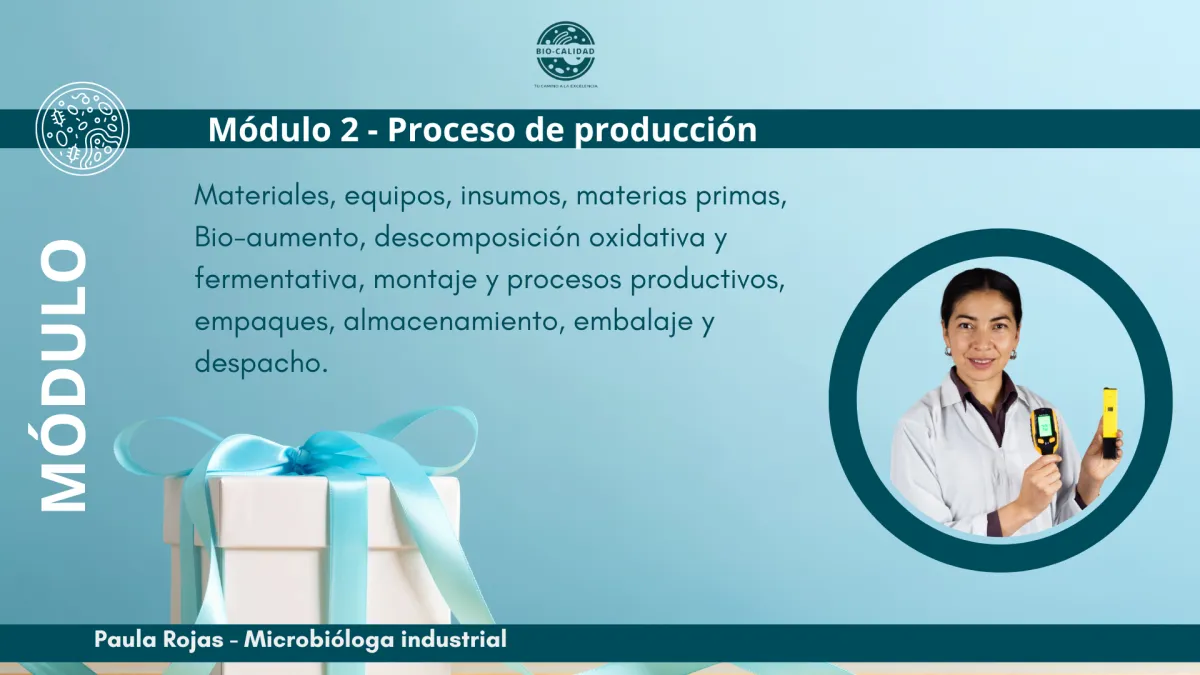 Módulo 2 Proceso de producción: Materiales, equipos, insumos, materias primas, Bio-aumento, descomposición oxidativa y fermentativa, montaje y procesos productivos, empaques, almacenamiento, embalaje y despacho.